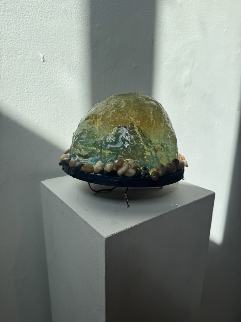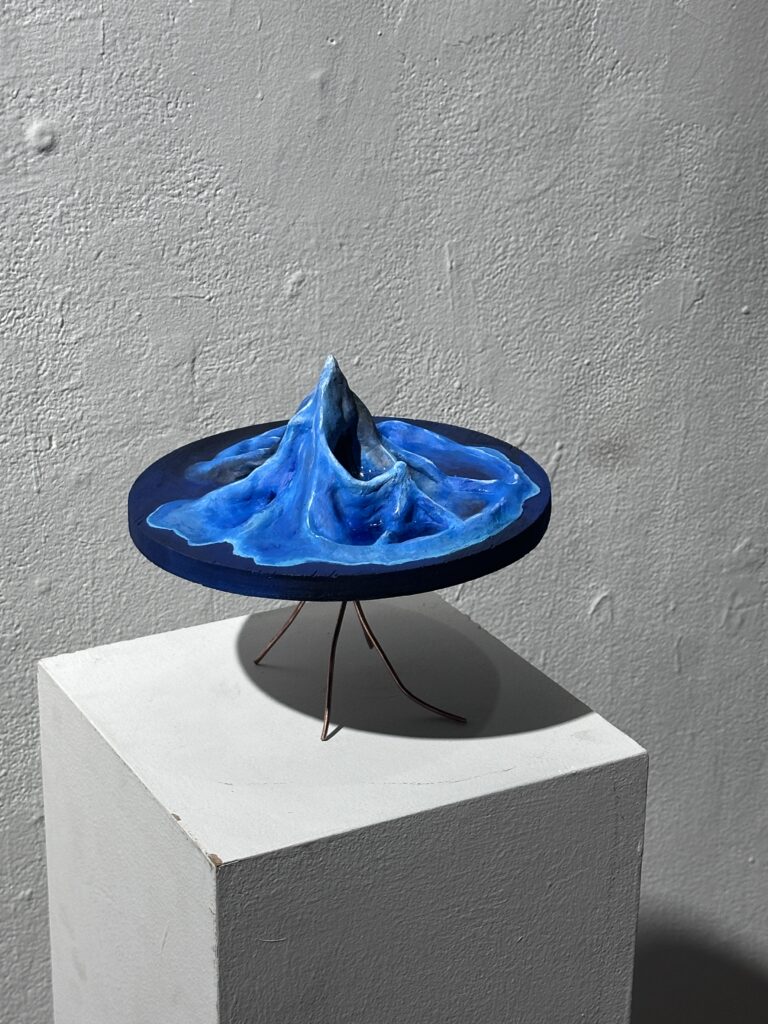 Lantia is a place from another plane of existence. A place I have been to in my past, where it is cold and no life survives. The island contains a powerful crystal that, once touched, transforms the island into Gaia. I decided to represent Lantia using clay, a wooden flat circular plane, acrylic paint, and a resin-sealed firmament to charge the crystal inside. On its bottom is resin infused with copper to give it a jellyfish-like tail that it can stand on.